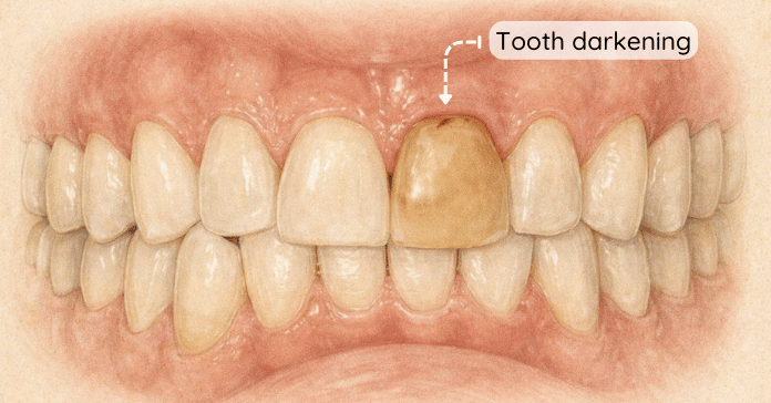 A front tooth may look slightly darker after a root canal because the pulp inside the tooth has been removed. This color change happens when the internal structure no longer receives a blood supply.